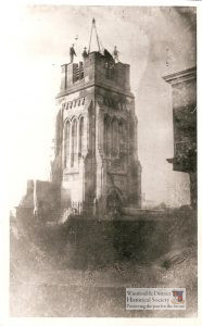 The demolition of Christ Church tower. One of three churches provided by the Weaver Navigation Trustees for the watermen. Built of stone in 1844, the church lasted less than forty years before its demolition due to subsidence. It was replaced by a timber framed building.